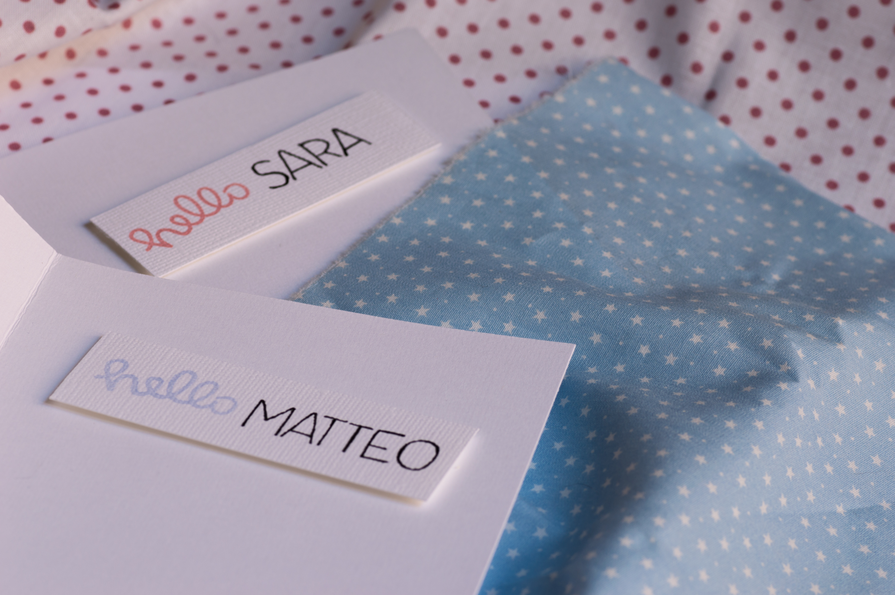 Biglietto 15x11cm realizzato in cartoncino di altissima qualità con una particolare texture sulla fronte, di colore bianco, impreziosito da un ritaglio di tessuto coordinato. La personalizzazione avviene all’interno, dove indicare il nome del neonato.