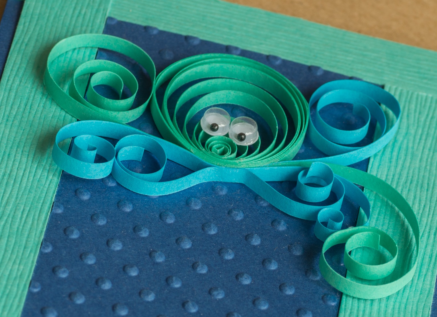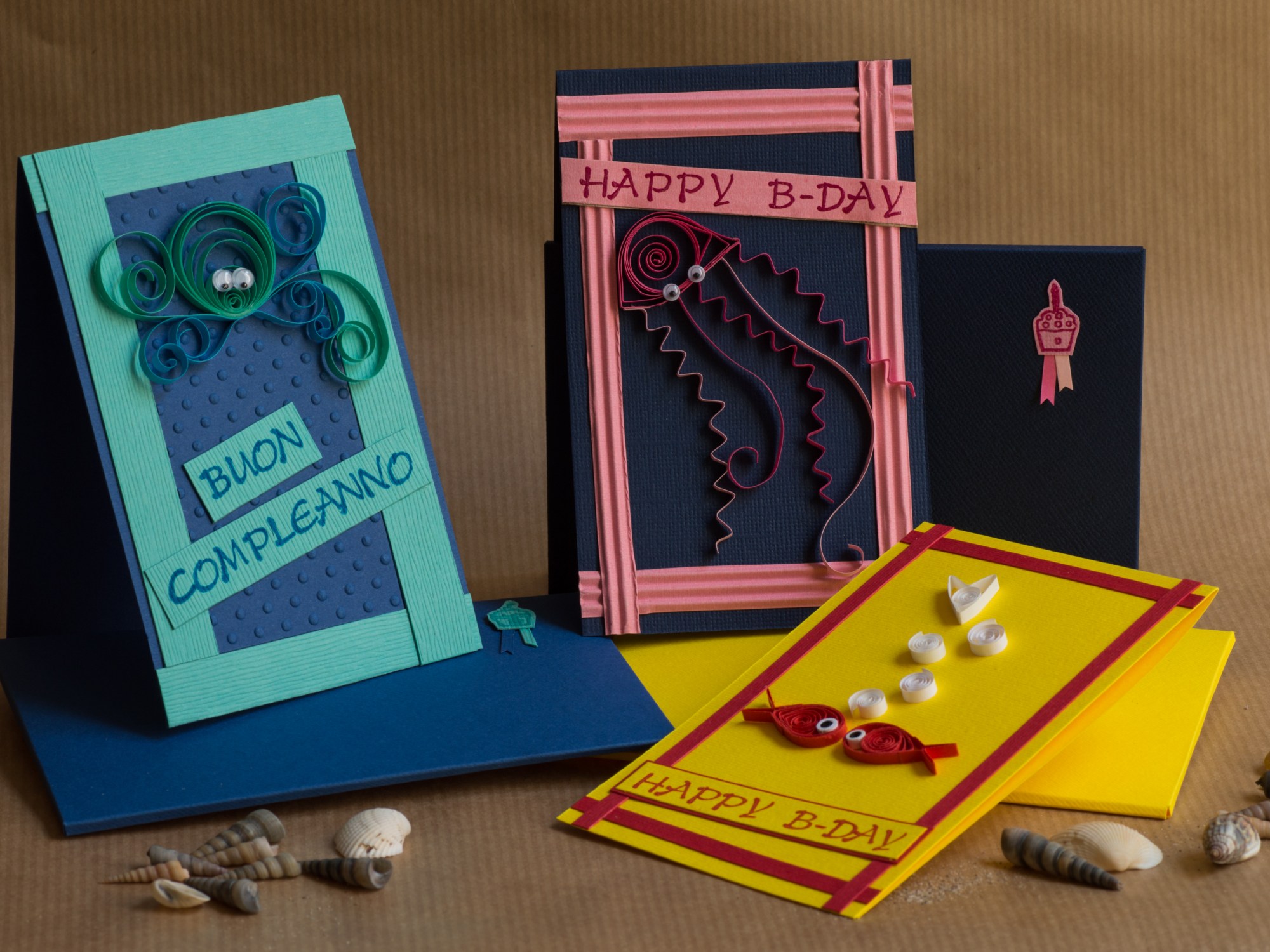 Biglietto a sviluppo verticale (13,5×8,5 cm) realizzato in cartoncino di ottima qualità, nei colori blu e acqua marina. La fronte è decorata dalla figura di un polipo ottenuta con la tecnica del “quilling“, un’antica tecnica di lavorazione di sottili strisce di carta ad uso decorativo (da “quill feathers” = penne d’oca, uno dei primi supporti utilizzati per arrotolare la carta).