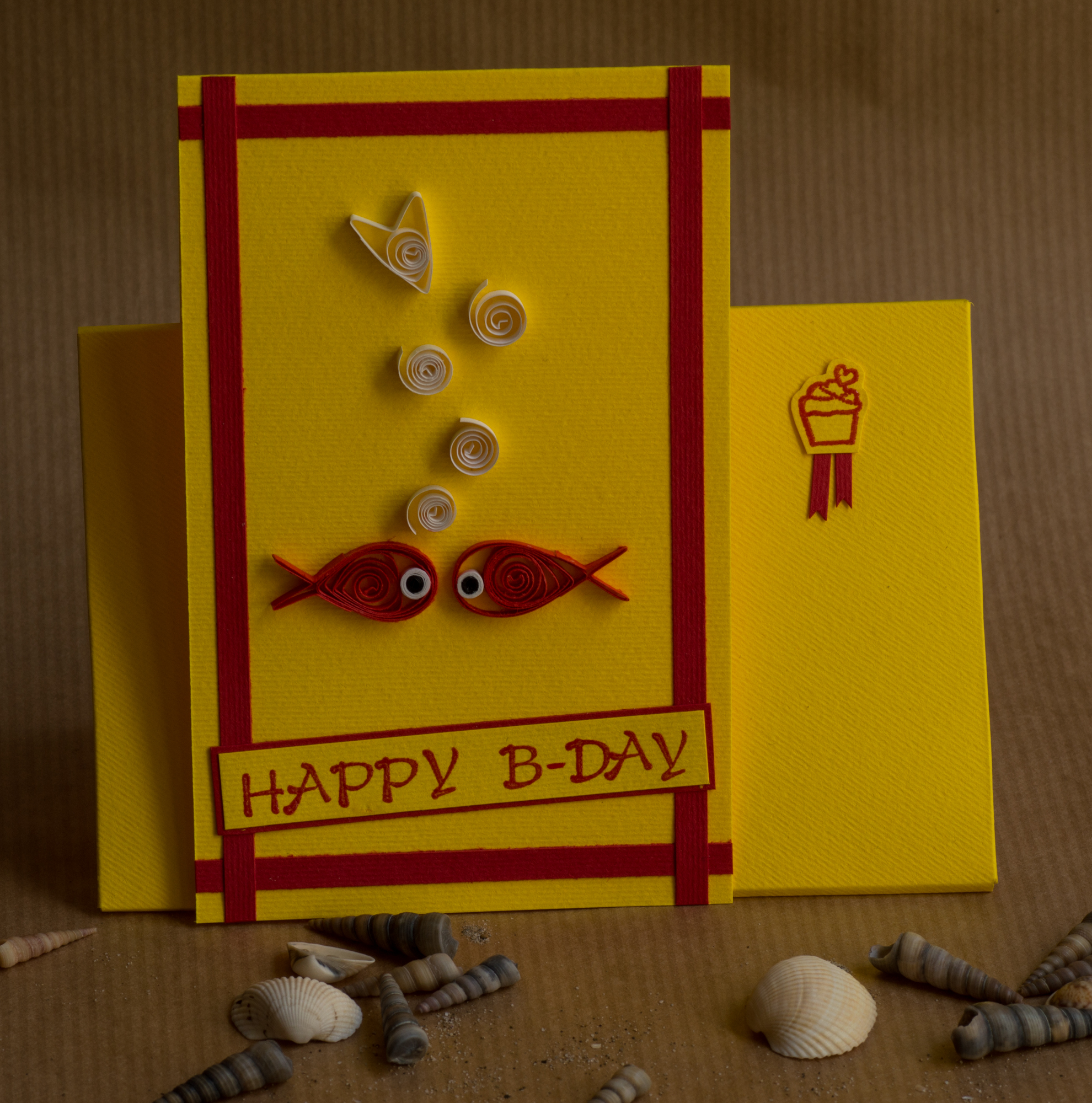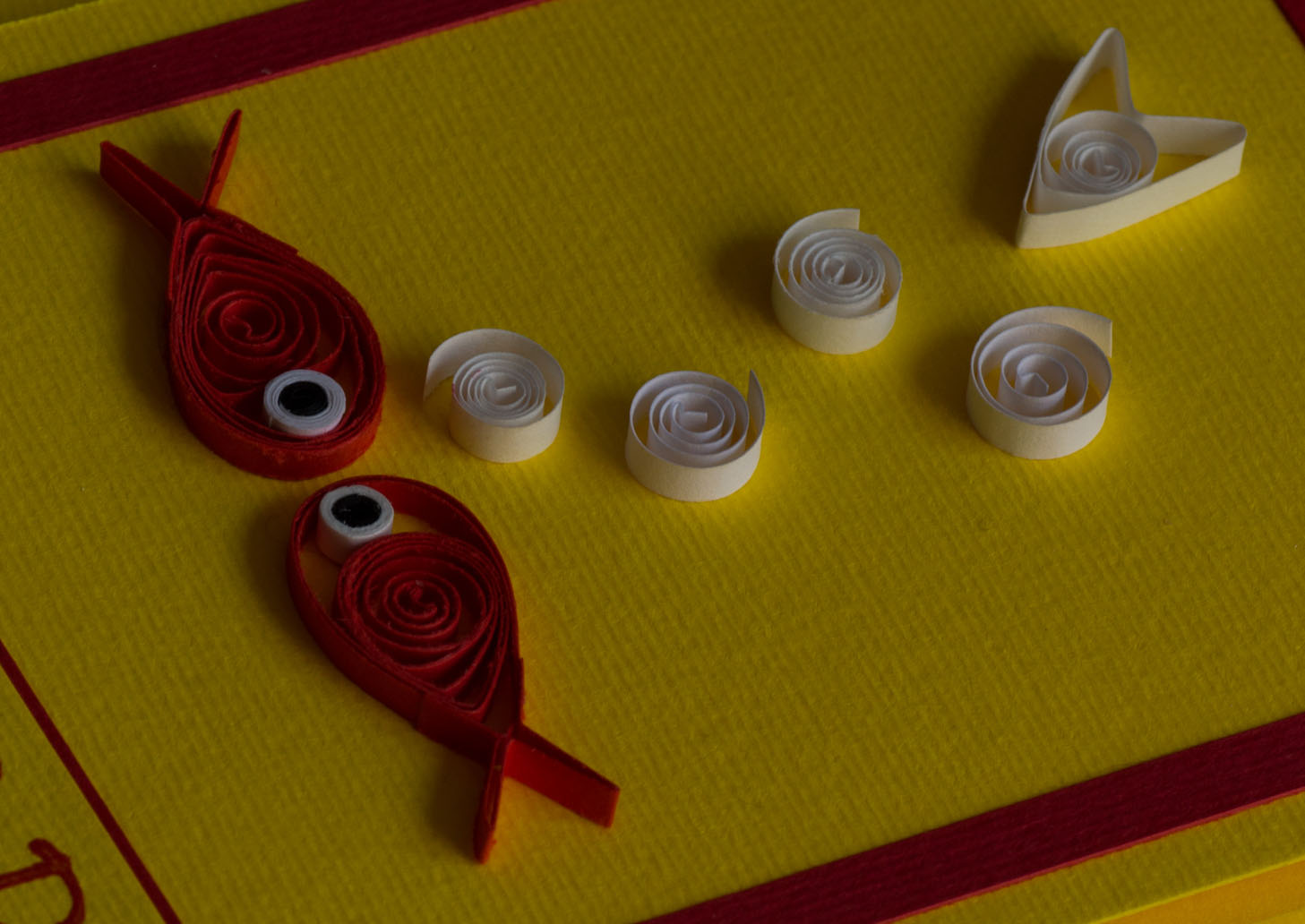 Biglietto a sviluppo verticale (13,5×8,5 cm) realizzato in cartoncino di ottima qualità, nei toni del giallo e del rosso. La fronte è decorata dalle figure di due pesciolini rossi ottenute con la tecnica del “quilling“, un’antica tecnica di lavorazione di sottili strisce di carta ad uso decorativo (da “quill feathers” = penne d’oca, uno dei primi supporti utilizzati per arrotolare la carta).