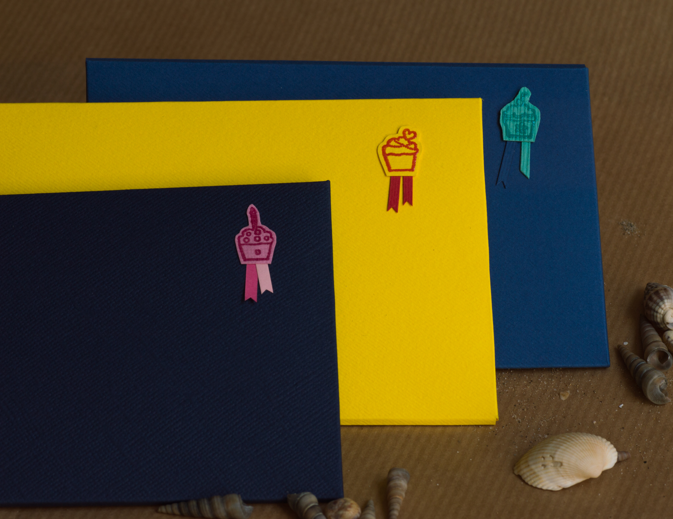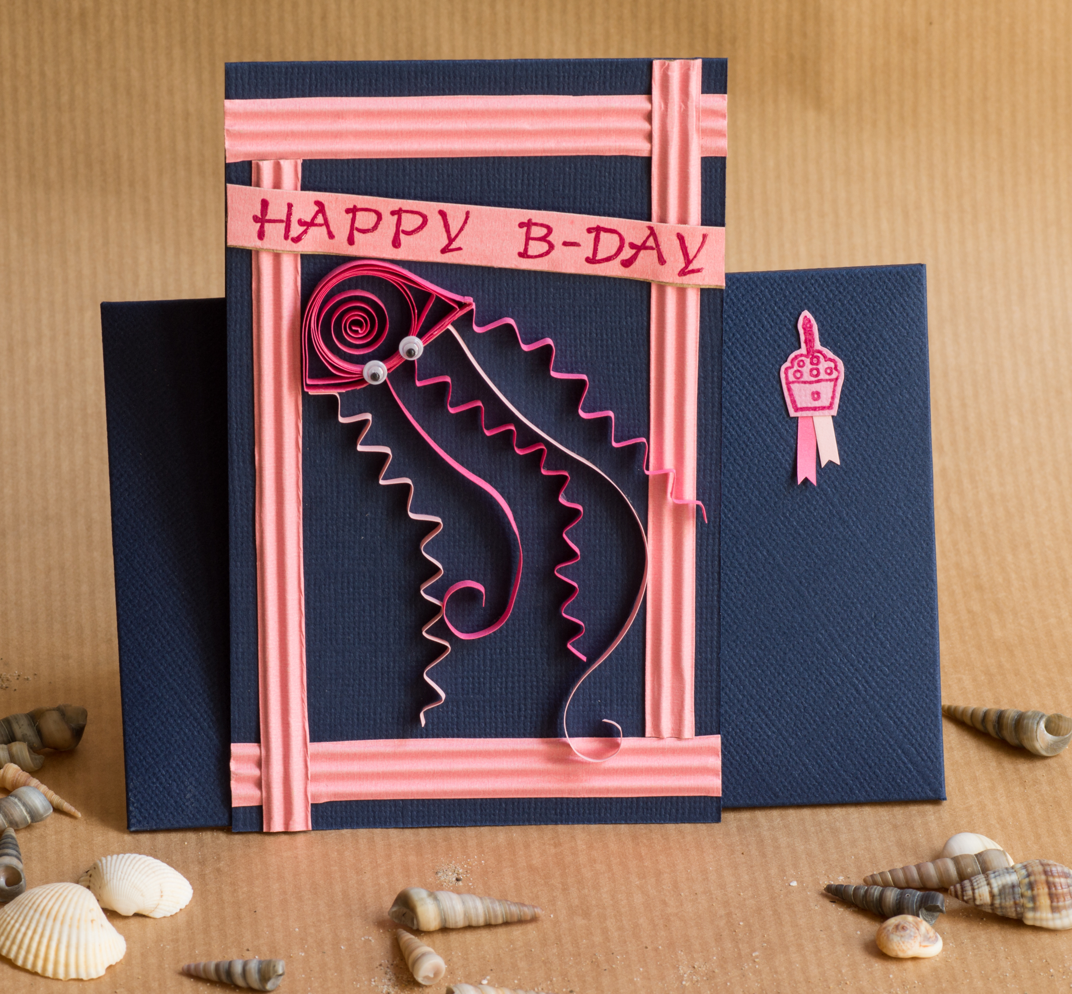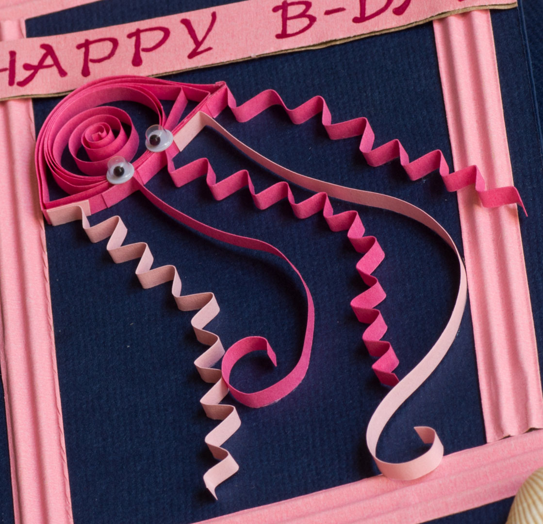 Biglietto a sviluppo verticale (13,5×8,5 cm) realizzato in cartoncino di ottima qualità, nei toni del blu profondo e rosa acceso. La fronte è decorata dalla figura di una medusa ottenuta con la tecnica del “quilling“, un’antica tecnica di lavorazione di sottili strisce di carta ad uso decorativo (da “quill feathers” = penne d’oca, uno dei primi supporti utilizzati per arrotolare la carta).