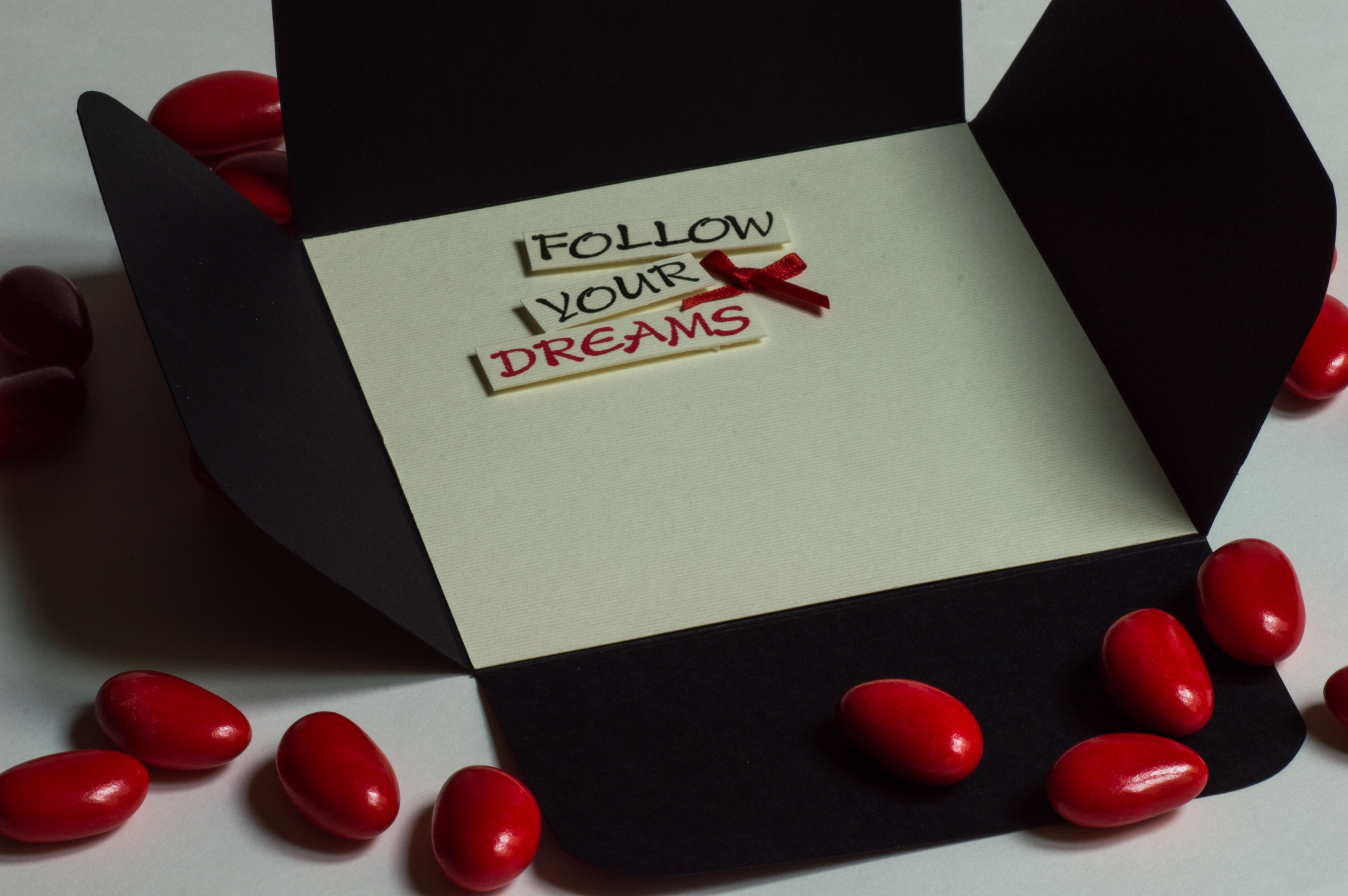 Biglietto quadrato (12×12 cm) che richiama nella forma il tipico cappello da laureato. Realizzato in cartoncino nero con apertura a quattro petali sul retro. All’interno il cartoncino color avorio, corredato dalla scritta a rilievo “Follow your dreams”, permette di aggiungere comodamente il proprio pensiero d’auguri per il neo laureato/dottorato! La fronte del biglietto è decorata con una piccola nappa di tessuto del colore del corso di laurea, fermata al cartoncino da un prezioso bottone in tessuto nero.