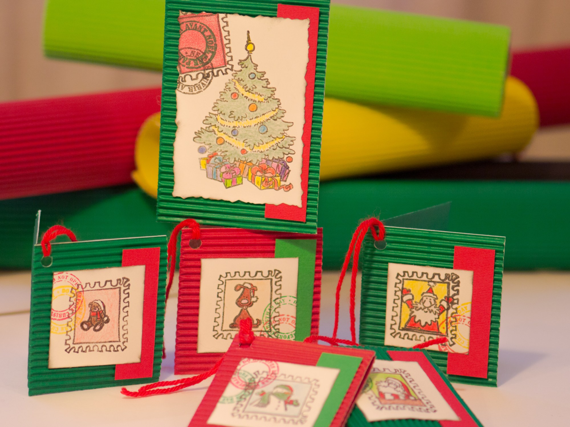 Un biglietto (12x8cm) e un chiudipacco (7,5x7cm) che richiamano alla mente le vecchie cartoline che venivano affidate alle poste (quelle vere, con francobollo e timbro!) per augurare Buon Natale ai propri cari…