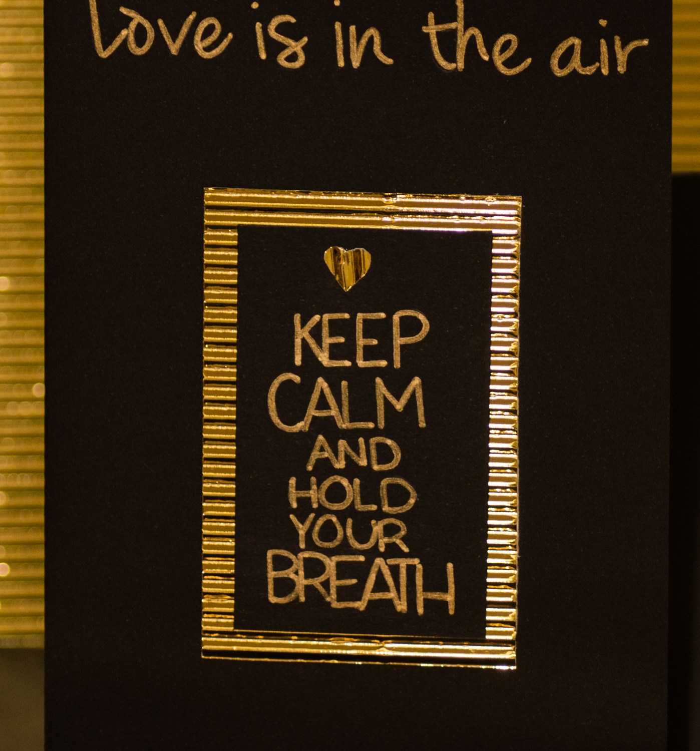 Biglietto a sviluppo verticale (15,5×11 cm con busta coordinata) realizzato in cartoncino nero con dettagli in color oro e scritta “Keep calm and hold your breath”.