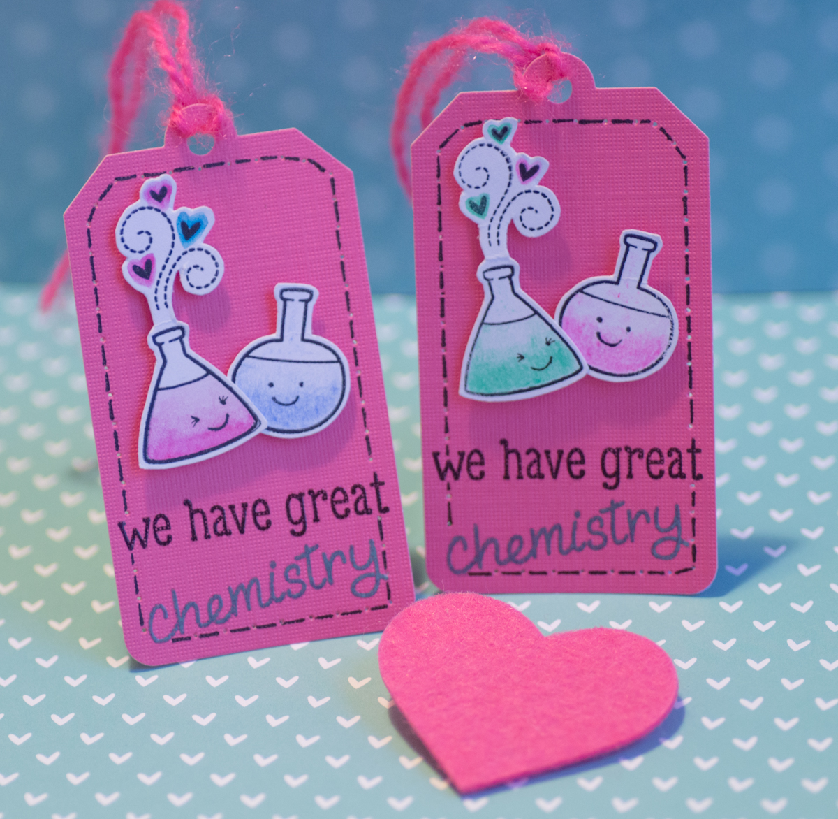 Sulla fronte due sagome di ampolle timbrate e colorate a mano e la scritta in rilievo “WE HAVE GREAT CHEMISTRY”.