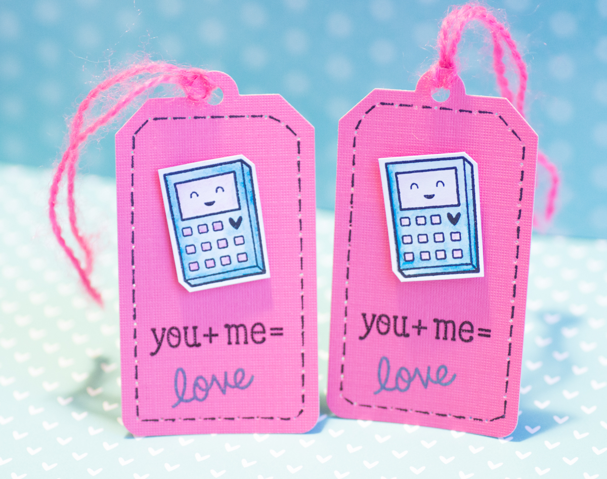 Sulla fronte la sagoma di una calcolatrice timbrata e colorata a mano e la scritta in rilievo “YOU+ME=LOVE”